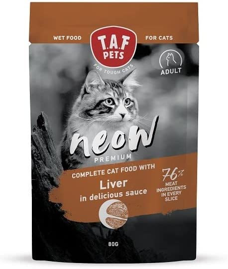 - TAF NEOW - Premium Alimento liquido completo per gatti adulti con fegato - 80g. Contiene: 76% carne e derivati animali a fette (pollame, maiale di cui 4% fegato, manzo), cereali (frumento 6%), proteine vegetali, minerali e derivati di origine vegetale (prezzemolo) 0,001%. Ingredienti: Ak. proteine: 7,0%Ak. oli e grassi: 4,5%Ak. cenere: 2,5%Ak. Fibra: 0,3% Umidità: 82,0% Calcio: 0,35% Fosforo: 0,25%