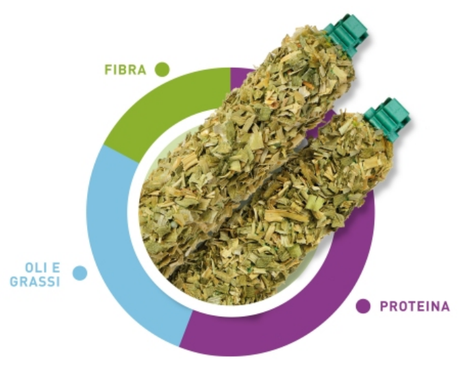 Friabili bastoncini cotti al forno, con spinacio ed erba medica, ricoperti di porro, da somministrare come complemento alla normale alimentazione degli animali.