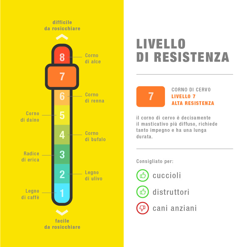 Il corno è resistente, ma esiste il rischio che si spezzi in piccole parti potenzialmente dannose. Assicurati di scegliere il masticativo con livello di durezza e taglia adeguate al tuo cane.